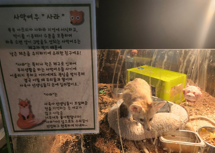 ‘사라’는 사육사가 직접 인공 포육을 진행했던 사막여우입니다. 구조 당시에는 돌봐줄 사람이 없는 상황에서 가로·세로 약 90cm에 불과한 좁은 어항 안에 갇혀 지내야 했으며, 사람이 다가오면 벽을 긁는 등 반복적인 정형행동을 보일 만큼 심한 스트레스를 받고 있었습니다.