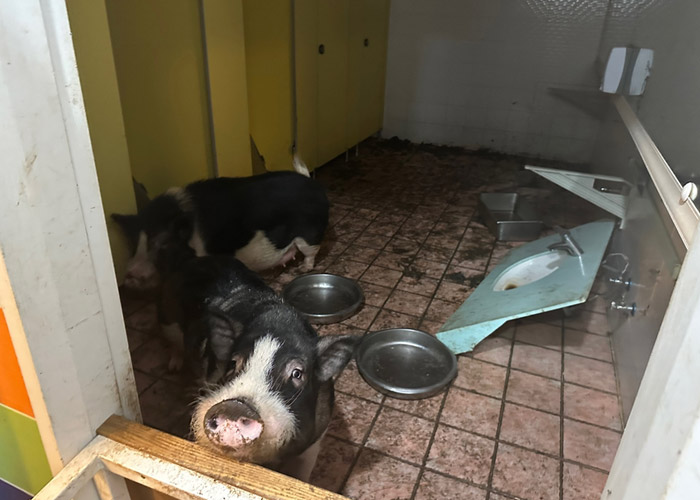 미니 돼지는 구조 당시 미끄러운 타일 바닥의 화장실에서 발견되었습니다. 걸음을 옮길 때마다 바닥에서 미끄러져 넘어지기 일쑤였고, 주변에는 오물과 배설물이 가 득 쌓여 있으며, 부서진 유리 조각까지 흩어져 있어 매우 위험한 상태였습니다. 또한 포만감을 채우기 위해 개 사료와 건빵을 먹으며 지내온 것으로 전해졌습니다.